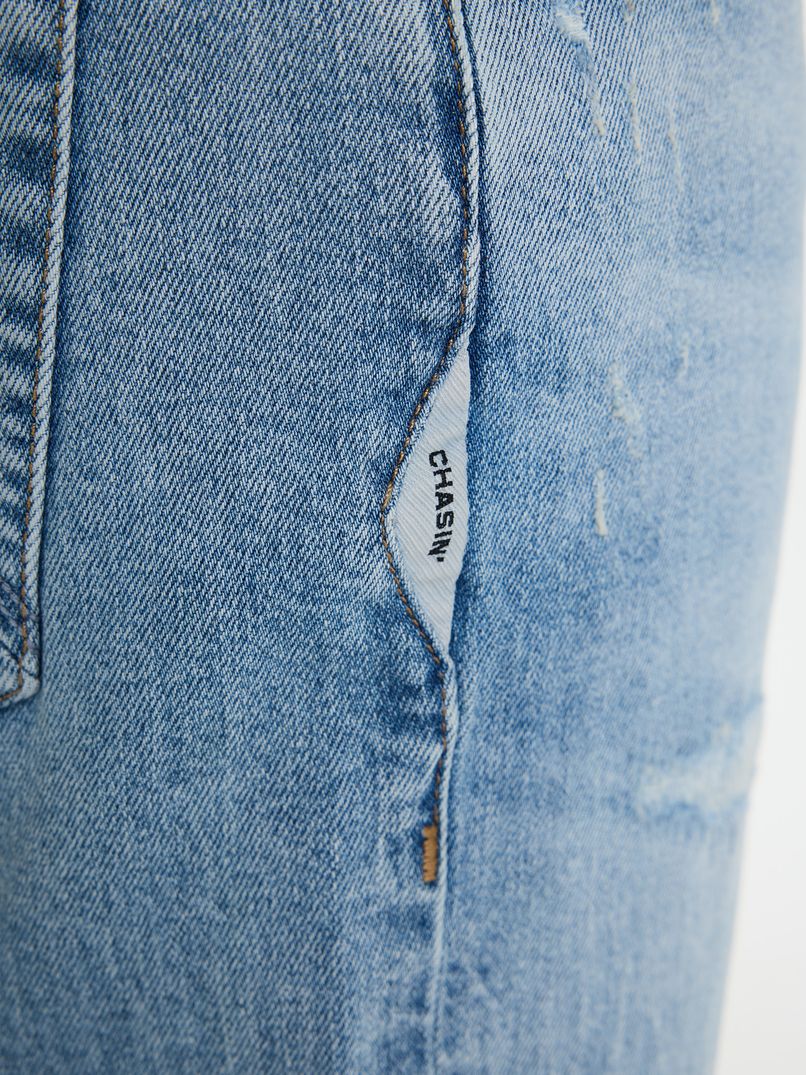 Die Ego.S Surge ist eine blaue Denim-Shorts mit schmaler Passform. Durch diese Passform liegen die Hosenbeine eng an den Oberschenkeln an, aber dank des bequemen Stretchmaterials hast du immer ausreichend Bewegungsfreiheit. Die Ego.S Surge ist mit dem charakteristischen CHASIN'-3-Stück-Logo auf den Gesäßtaschen und dem Branding an der Seite und der Münztasche versehen.